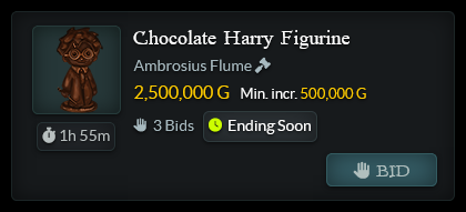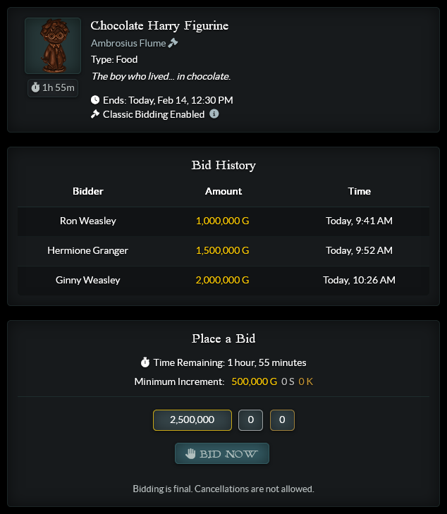 If you have found an item you would like to buy, you can choose to bid on it! This section will automatically give you the the lowest bid possible including the minimum increment. If you want to bid higher, type in the amount you would like to bid manually. The bid amount field will accept both K, M, and B as shorthand for a thousand, a million, and a billion respectively. For example, bidding 1K will bid 1,000 Galleons, bidding 1M will bid 1,000,000 Galleons, and bidding 1B will bid 1,000,000,000 Galleons.