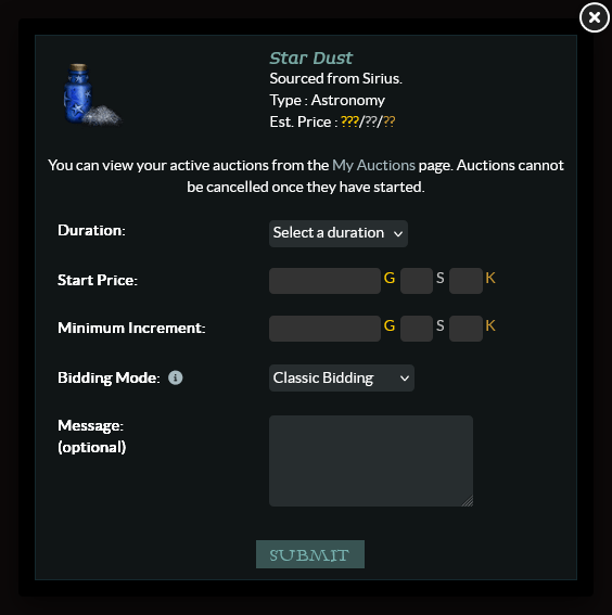 Starting an auction is final! You cannot cancel an auction once it is started under any circumstances, so before you click, make absolutely sure you have chosen an item you actually want to auction. You cannot bid on your own auctions.